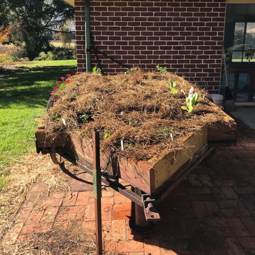 We dug holes, put the plants in carefully, surrounded with more soil and hay. We watered with a little bit of nutrients from Mums worm farm mixed with water. I also wrote tags and put next to each plant. Gardening gloves is a must.