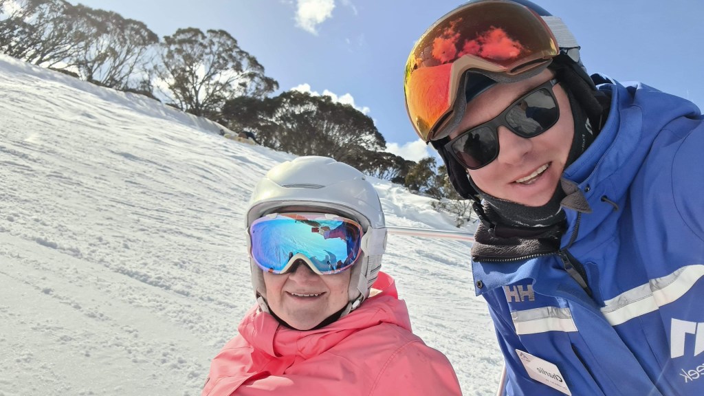 I listened and learnt a lot. Nemo asked what I was thinking about. I was trying to remain calm by thinking about unicorns, rainbows and ice-cream. He encouraged me to think about turn shape. We came up with a mantra to think about leaning, elbow touching the snow, uphill to wash off speed, centre to go into the next turn. I even did the occasional 360 or slowed to a rest stop. I improved and my confidence grew. It was reassuring to receive comments that I was doing well. I was my harshest critic. I even had encouraging comments from APSI trainer Tom Hodges. Chairlift loading and unloading was an ease too which previously scared me.